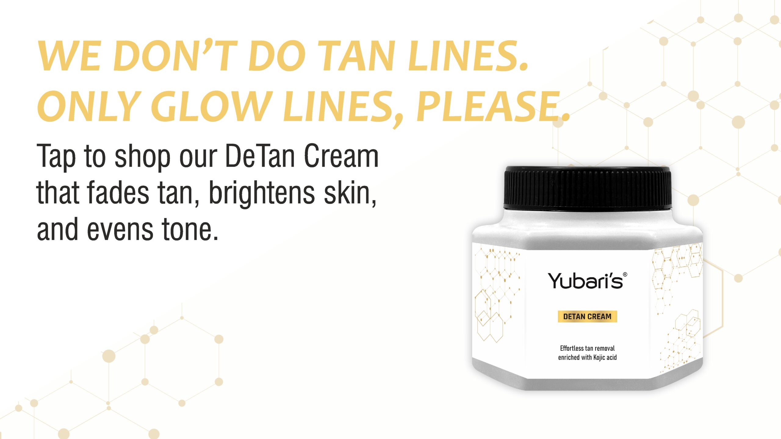 Why settle for uneven skin when you can glow instead? Our DeTan Cream gently fades tan, evens out your tone, and brings back your natural radiance. Ready to glow?